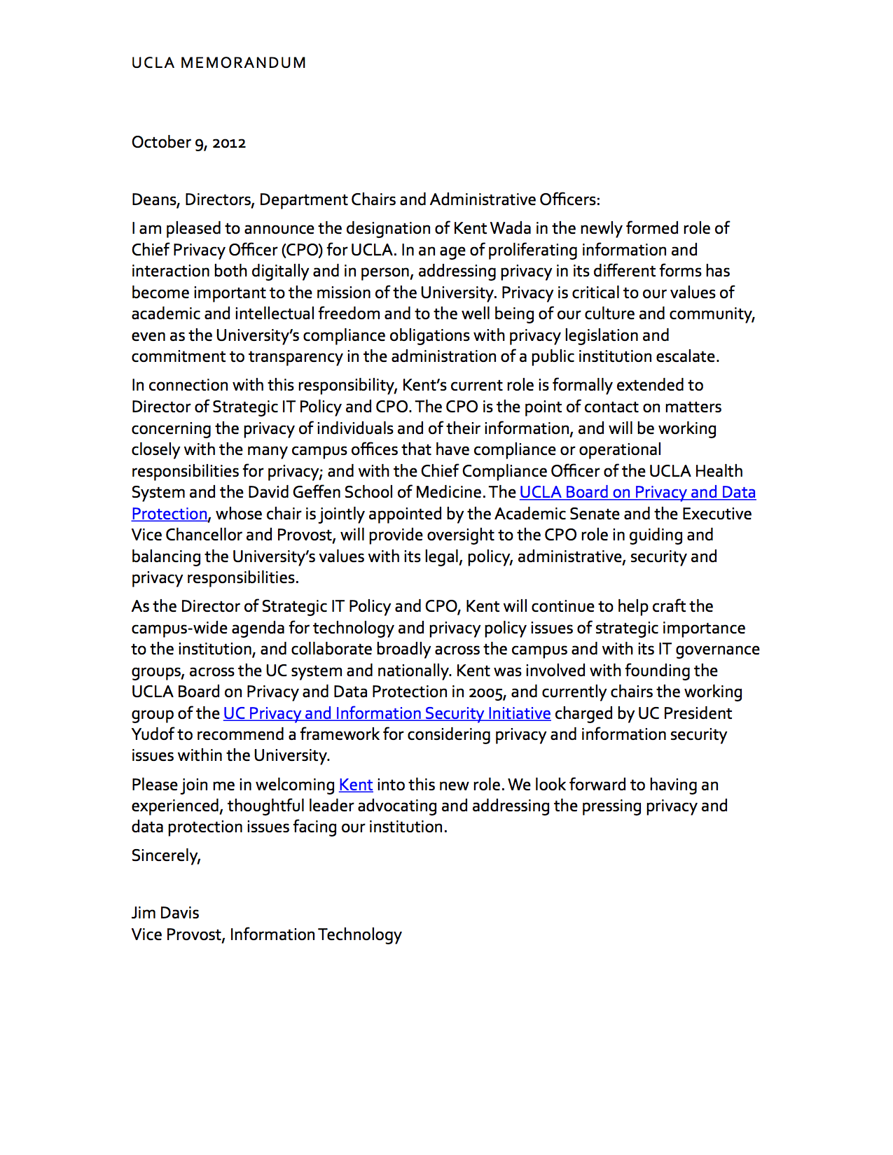 In June of 2010, former UC President Mark Yudof convened the University of California Privacy and Information Security Steering Committee to perform a comprehensive review of the University’s current privacy and information security policy framework and to make recommendations about how the University should address near-term policy issues and longer-term governance issues related to privacy and information security.