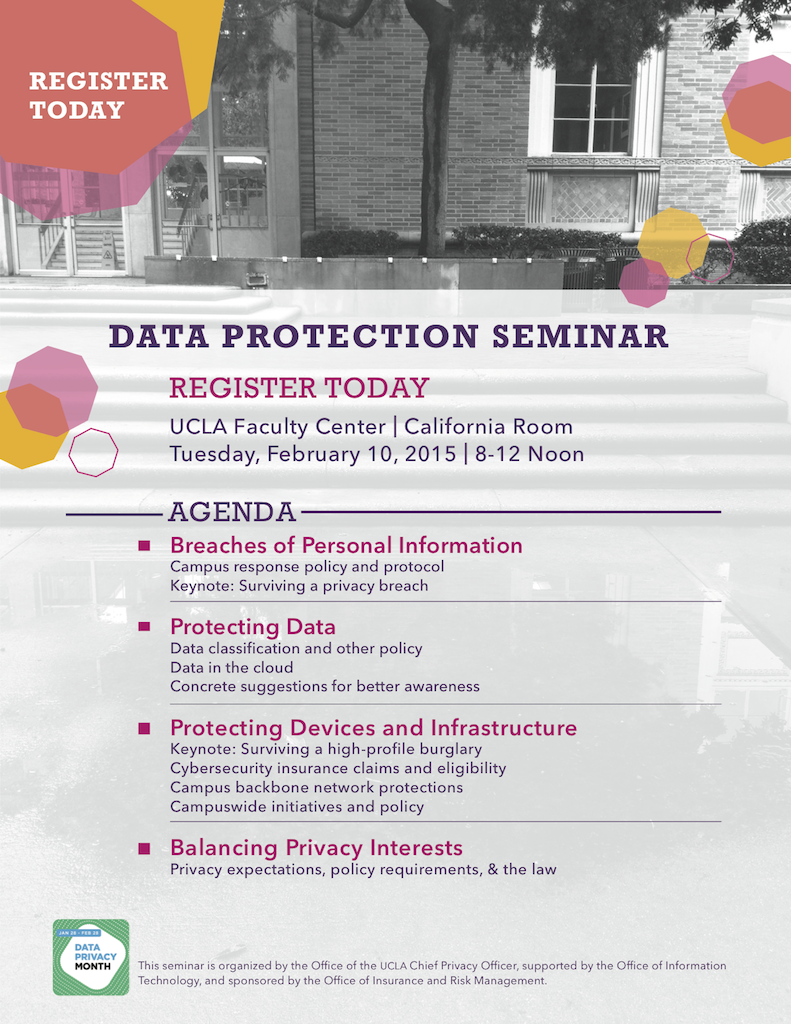 The seminar will begin at 8am with a light breakfast and end at noon. It is organized by my office, supported by the Office of Information Technology, and sponsored by the Office of Insurance and Risk Management as part of the campus’s activities for Data Privacy Month.